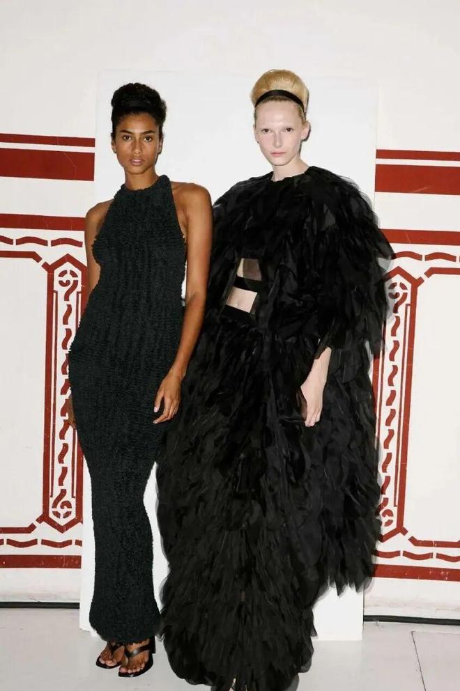 系列以轻盈的夏季面料构筑结构感廓形,Nappa 皮革风衣、棉质衬里礼服在严谨剪裁中注入松弛气息;羽毛点缀长袍、回收玻璃纤维打造的亮色“皮草”,突破材质边界。色彩以低饱和黑白灰为基调,点缀岩浆红、水晶紫等亮色,力量与柔美在垂坠与挺拔间平衡。
