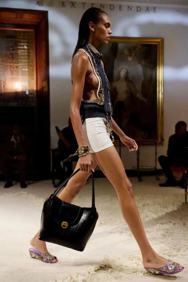 在 Versace 的语境中,性感早已超越外在的诱惑,成为对生命的赞歌。每一处廓形与剪裁都承载着身体的回响:贴合、环绕、聚合,仿佛与肌肤共呼吸。金属质感的礼裙轻盈闪耀,刺绣皮革与印花丹宁交织成感性与力量的对话,古典主义与街头感织碰撞,凝练出独属意式的精准与锋芒。