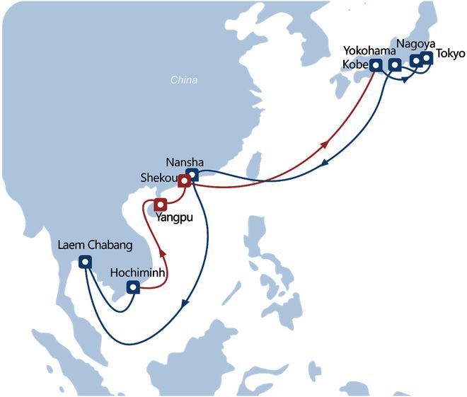 JTV航线日)在神户首航,挂靠港序为:神户-名古屋-东京-横滨-南沙-林查班-胡志明-洋浦-蛇口-泉州*-神户(*为试挂)。